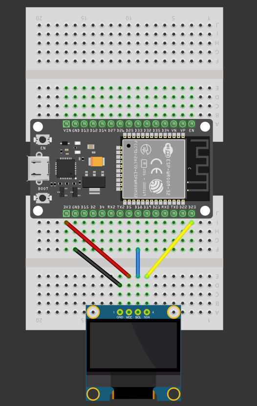The ESP32 devkit is slightly wider than usual. If you use a standard breadboard, you might struggle to fit the board, as I did. To solve this, I bought two mini breadboards, placed the ESP32 between them, and connected each side.