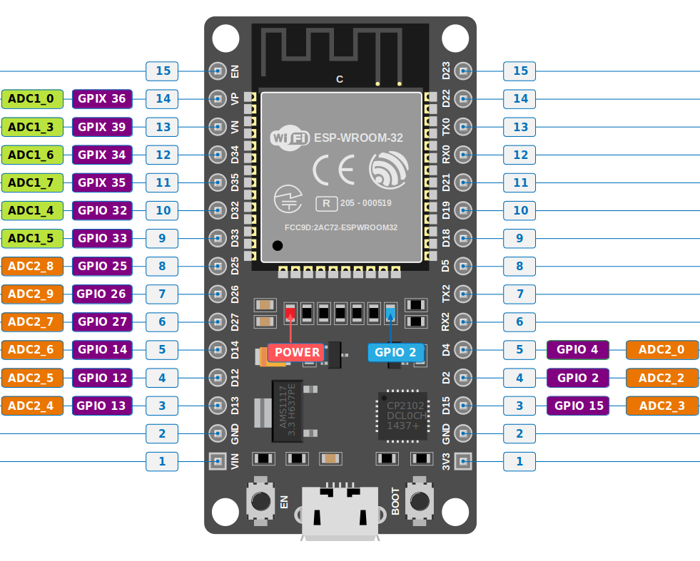 Input-Only GPIOs: GPIO pins 34, 35, 36, and 39 are input-only and cannot be used as output pins. In the pinout diagram, these pins are labeled with a "GPIX" prefix and marked with an "X" to indicate output is not allowed. Whenever possible, prefer using the pins highlighted in purple on the diagram.