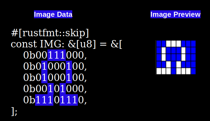 #![allow(unused)] fn main() { let bmp_data = include_bytes!("../../embedded-rust.bmp"); let bmp = Bmp::from_slice(bmp_data).unwrap(); let image = Image::new(&bmp, Point::new(10, 0)); image.draw(&mut display).unwrap(); }